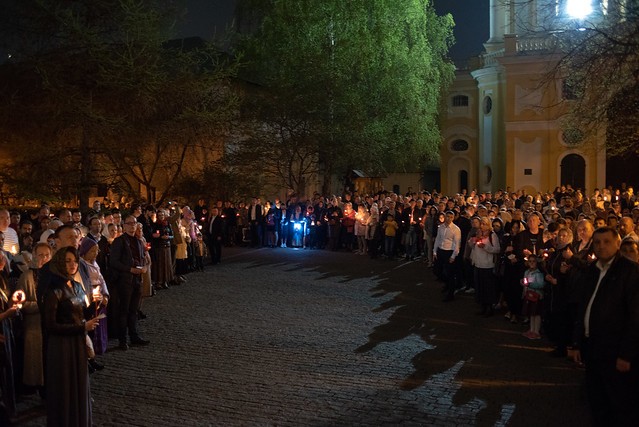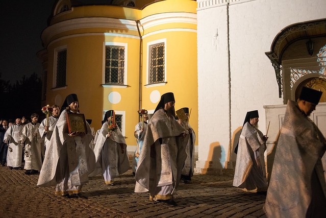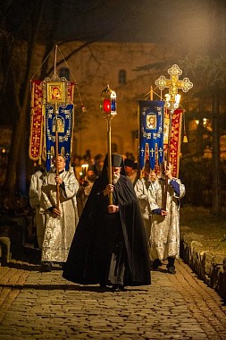 В полночь пение стихиры «Воскресение Твое, Христе Спасе» возвестило о наступлении Воскресения Христова. С зажженными свечами верующие прошли крестным ходом, после которого насельники монастыря в священном сане приветствовали боголюбивую паству вечно живыми и радостными словами: «Христос воскресе!»