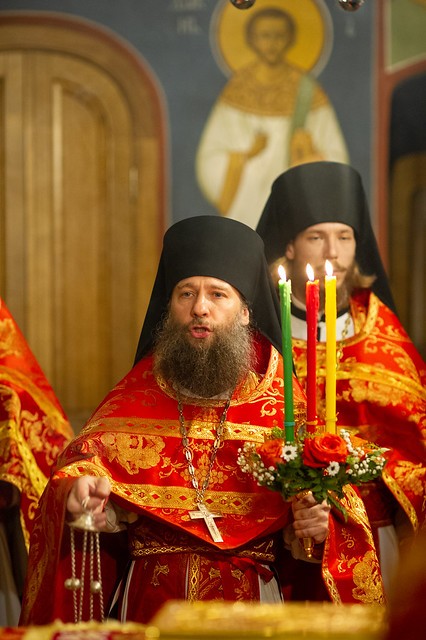 Незадолго до начала богослужения в Новоспасский монастырь был принесен Благодатный огонь, прибывший в Москву от Гроба Господня.