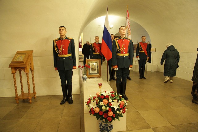 По окончании Литургии наместник Новоспасского монастыря отслужил в храме прп. Романа Сладкопевца в усыпальнице бояр Романовых панихиду по Великому князю.