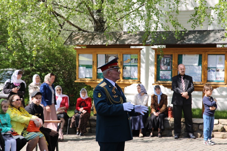 Затем начался концерт колокольных звонов. По традиции, на Светлой седмице в Новоспасский монастырь со всей Москвы и других городов съезжаются звонари. В музыку военного оркестра вливались колокольные звоны. Таким необычным образом были исполнены Тухмановский «День Победы» и «Славься».