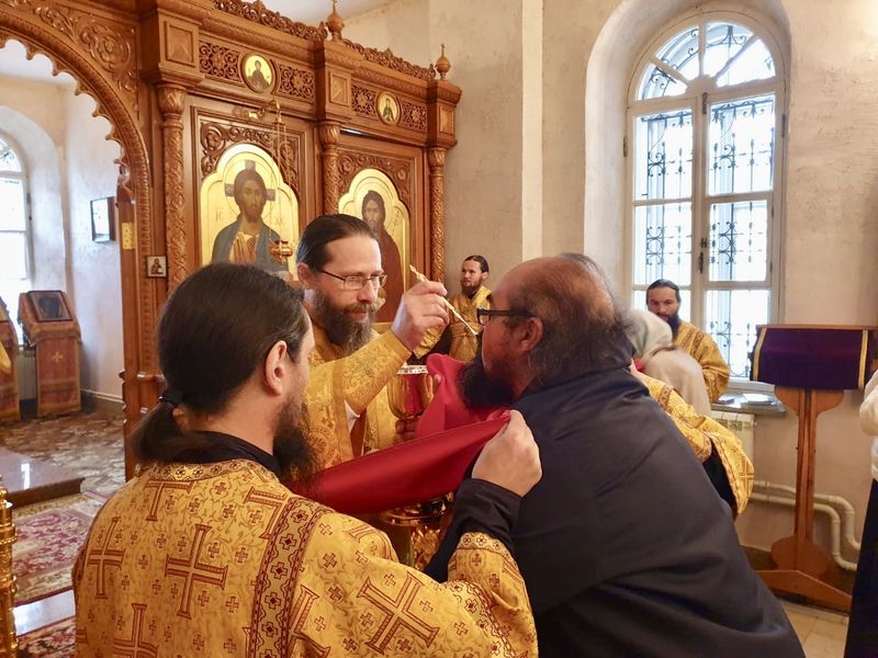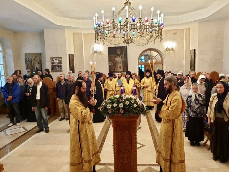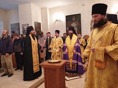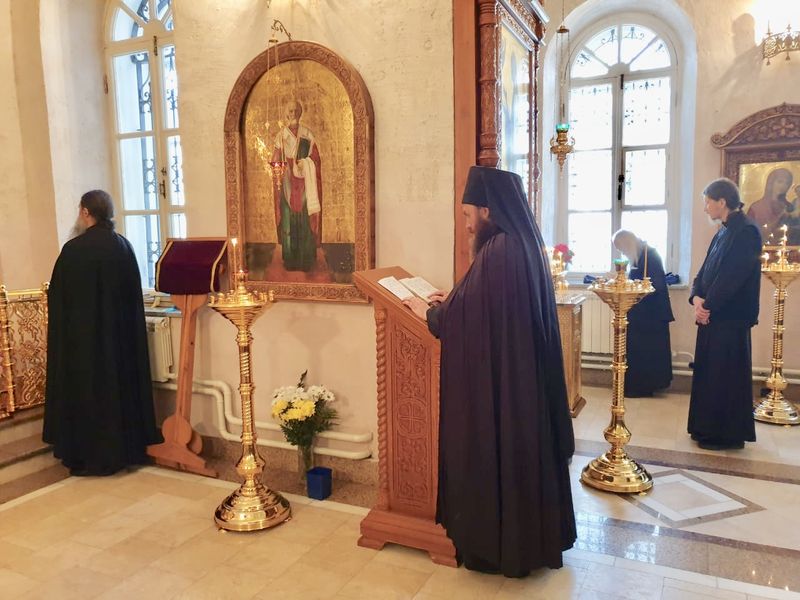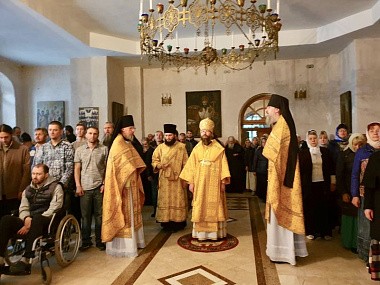 Его Преосвященству сослужили братия в священном сане, а также насельник Михаило-Архангельского мужского монастыря Новосибирской митрополии иеромонах Николай (Трачев) и иеромонах Кирилл (Саввин) из Успенского мужского монастыря Орловской епархии.