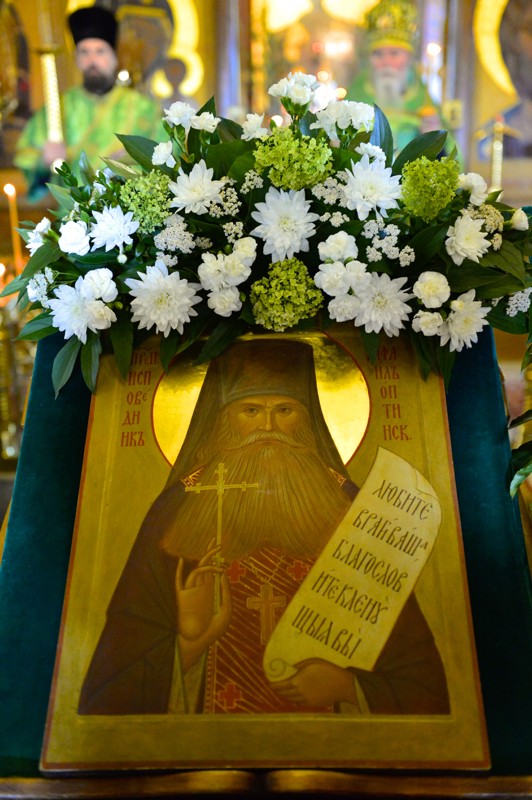 В праздничный день во Введенском ставропигиальном мужском монастыре Оптина пустынь в Преображенском храме, где находится рака с мощами подвижника, была отслужена Божественная литургия.
