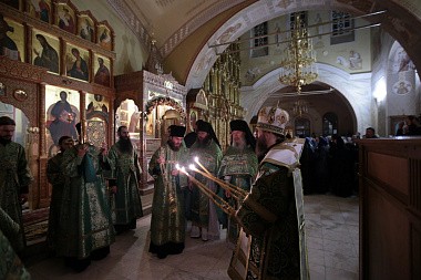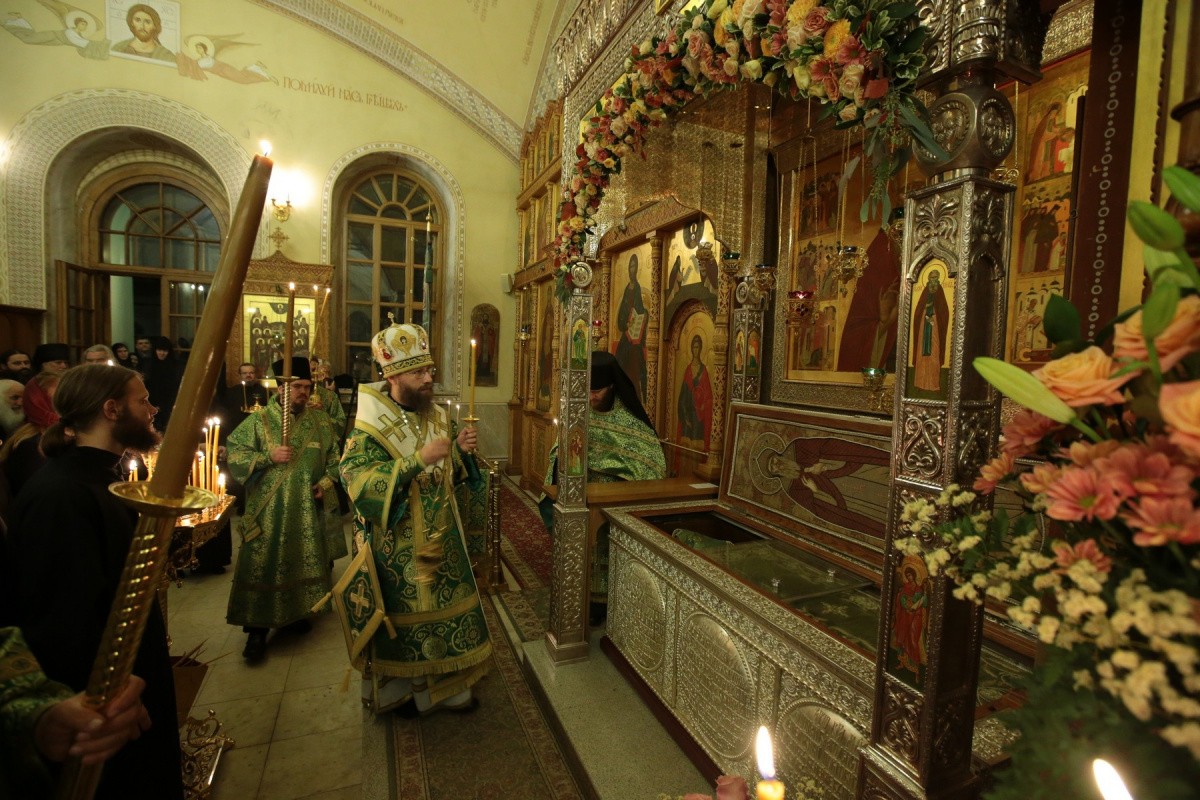 Накануне наместник монастыря епископ Можайский Леонид, викарий Святейшего Патриарха Московского и всея Руси, совершил в Введенском соборе в сослужении братии обители в священном сане малую вечерню с чтением акафиста прп. Амвросию Оптинскому перед ракой с его святыми мощами.