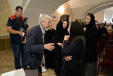 Не менее интересной частью прошедшей лекции стало общение Владимира Алексеевича с аудиторией, которую на этот раз составили насельники монастыря во главе с наместником епископом Леонидом и старшей братией, оптинские паломники, а также специально приехавшие на встречу более тридцати молодых людей из православных приходов Москвы – участники молодежной организации «Покров», многие из которых уже неоднократно бывали в Оптиной пустыни.