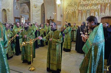 Вечером, накануне Собора всех святых, в Оптиной пустыни просиявших (подробнее о празднике по ссылке), в монастыре также в нескольких храмах совершалось всенощное бдение и в день праздника – несколько Литургий. Каждый богомолец мог принять участие в богослужении и разделить радость совместной праздничной молитвы. Всенощное бдение в Казанском храме и Божественную литургию во Владимирском храме возглавил наместник Введенского ставропигиального мужского монастыря Оптина пустынь епископ Можайский Леонид.