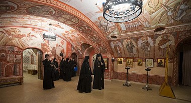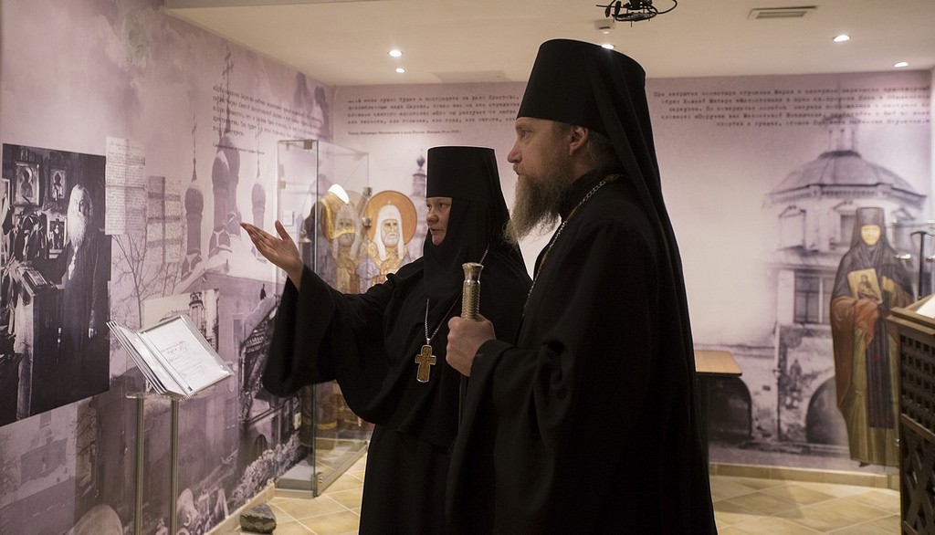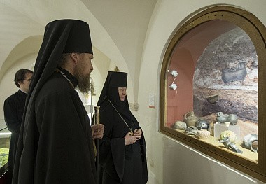 После богослужения епископ Иоанн посетил Музей истории монастыря в подклети храма Рождества Пресвятой Богородицы, где ознакомился с результатами археологических работ на территории обители и экспозициями уникальных находок, а также различных предметов монастырского быта, сохраненных боголюбивыми людьми в годы гонений. Матушка игумения провела для Владыки экскурсию, рассказала об основных событиях истории и святынях монастыря.