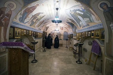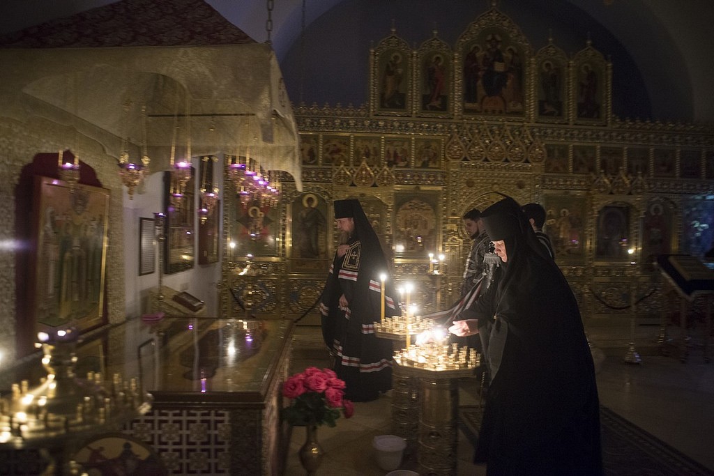 Его Преосвященство поклонился главным монастырским святыням: гробнице на месте почитания преподобных основательниц обители Иулиании и Евпраксии Московских, чтимой иконе Божией Матери «Милостивая», а также приложился к частице мощей прп. Андрея Критского, ковчег с которой в первые четыре дня выносится в центр храма для поклонения верующих.