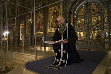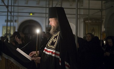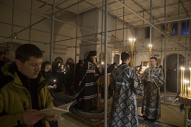 В своем кратком простом, но глубоком по содержанию напутствии Преосвященный владыка напомнил о тех примерах падений и восстаний, которые содержатся в тексте Великого канона, а также о той борьбе, которая предстоит каждому на поприще поста, и о той цели – встрече с Господом, – к которой предстоит всем христианам приближаться в течение своей жизни, а наипаче в благоприятное время Великого поста.