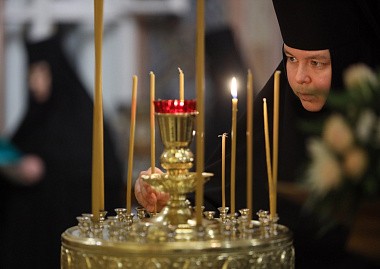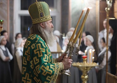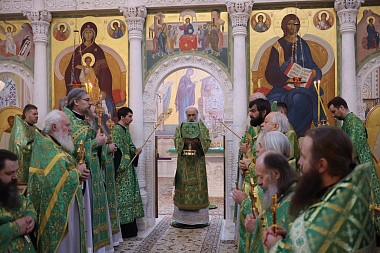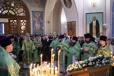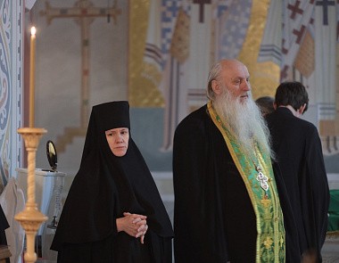 Раннюю Литургию в Покровском соборе обители перед ракой со святыми мощами Радонежских чудотворцев совершил председатель Синодального отдела по монастырям и монашеству архиепископ Каширский Феогност.