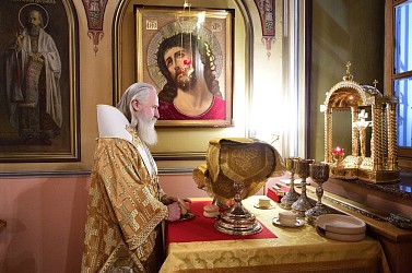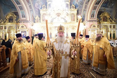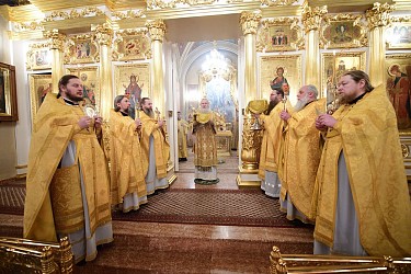 За Божественной литургией в соборе Воскресения Словущего Его Высокопреосвященству сослужили клирики обители.