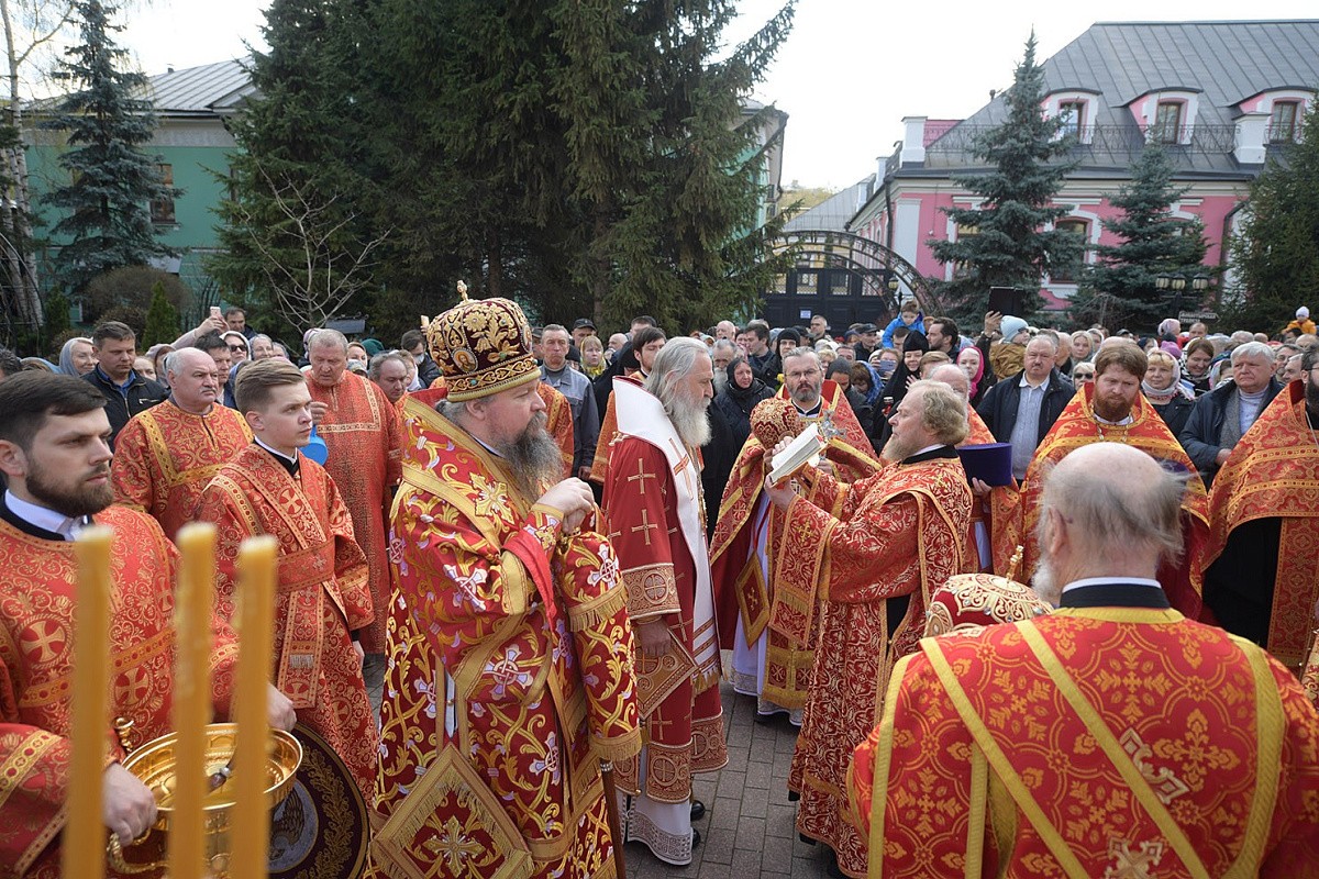 По окончании Литургии состоялся крестный ход вокруг храмов обители. У мощей блаженной Матроны Московской митрополит Дионисий прочитал молитву святой старице. Хор торжественно пропел тропарь и величание блаженной Матроне.