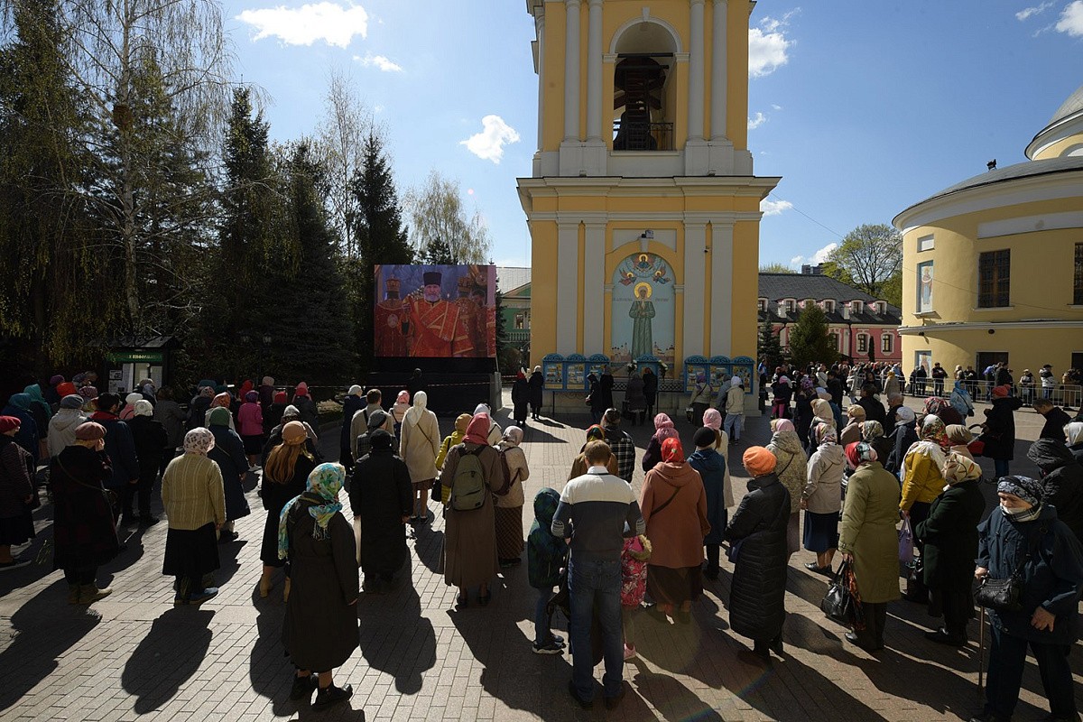 Для удобства верующих богослужение транслировалось на большом экране, установленном на монастырской площади. Также была организована прямая трансляция на телеканалах «Спас» и «Союз» и на официальном сайте Покровского монастыря.