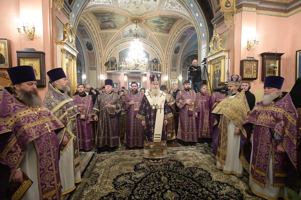 По прибытии в обитель архипастырь поклонился честным мощам блаженной Матроны Московской, почивающим в Покровском храме, а затем возглавил вечерню и Литургию Преждеосвященных Даров в Воскресенском соборе монастыря.