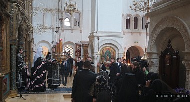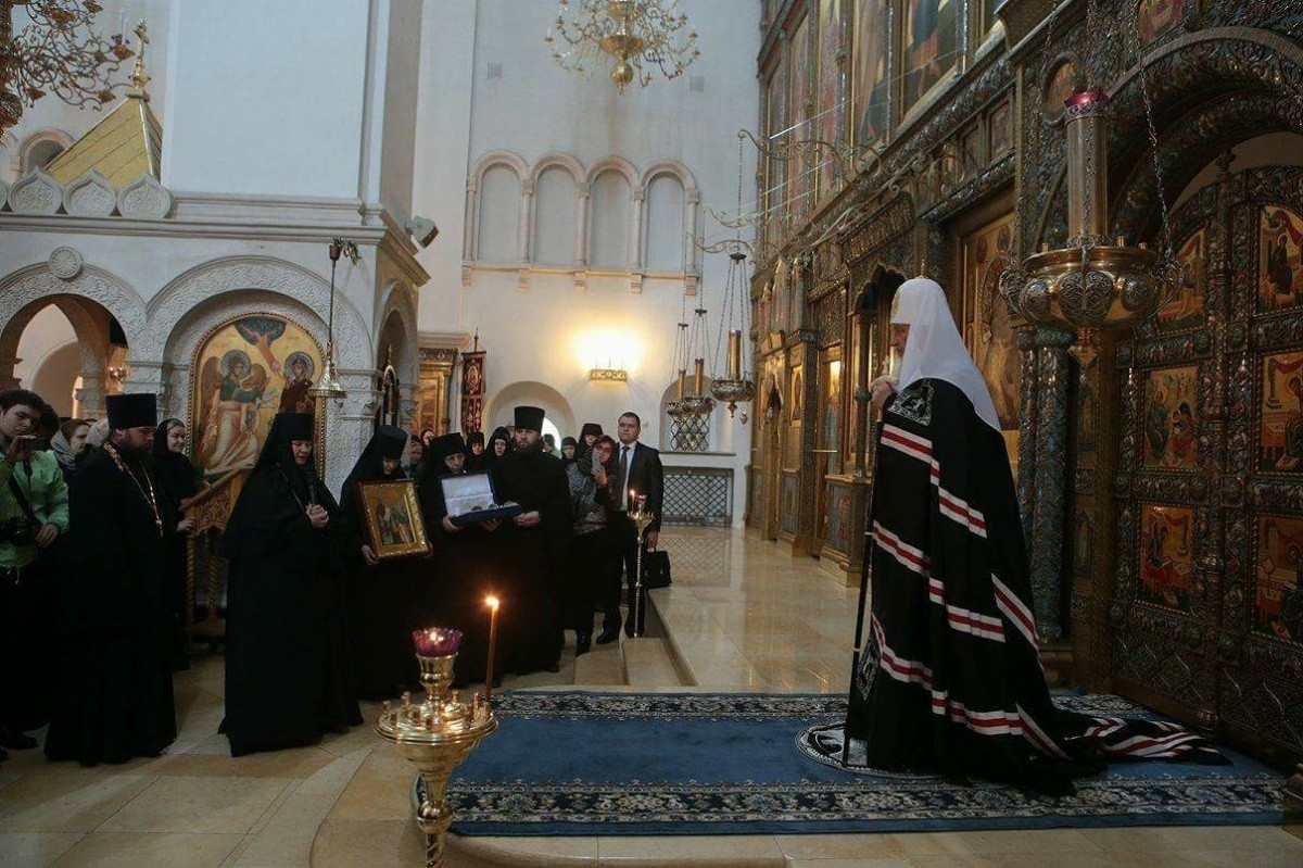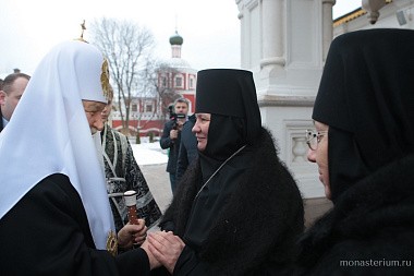 По окончании богослужения настоятельница Зачатьевского монастыря, заместитель председателя Синодального отдела по монастырям и монашеству игумения Иулиания (Каледа) приветствовала Предстоятеля Русской Православной Церкви. Игумения Иулиания поздравила Святейшего Патриарха с началом Святой Четыредесятницы и днем памяти святого равноапостольного Кирилла, учителя Словенского, и преподнесла Его Святейшеству икону с изображениями Его Небесных покровителей – святого равноапостольного Кирилла и святителя Марка Эфесского (в день памяти этого святого состоялась интронизация Святейшего Патриарха Кирилла), – а также набор светильников.