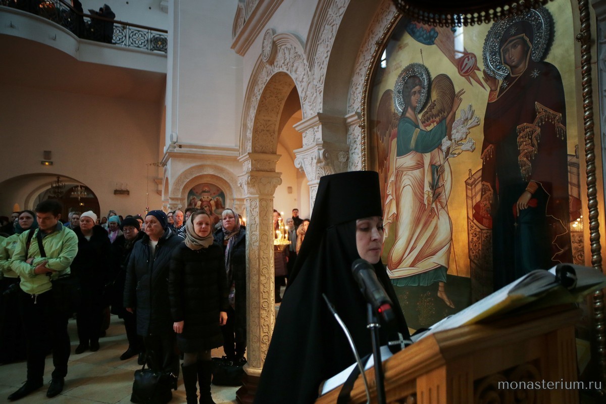 27 февраля 2017 года, в понедельник 1-й седмицы Великого поста, день памяти святого равноапостольного Кирилла, учителя Словенского (869), Святейший Патриарх Московский и всея Руси Кирилл молился за уставным богослужением в Зачатьевском ставропигиальном женском монастыре Москвы. Были совершены утреня, часы, изобразительны и вечерня.