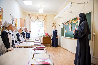 Директор гимназии игумения Феофания (Мискина) поздравила учителей, ребят и их родителей с началом нового учебного года: