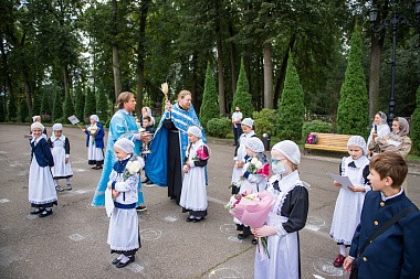 Перед первым уроком духовник гимназии иерей Сергий Сивоконь отслужил молебен на начало нового учебного года и обратился с напутственным словом к ученикам, а иерей Андрей Бархатнов окропил всех собравшихся святой водой.