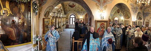 По окончании Литургии монастырское духовенство вместе с богомольцами прошли крестным ходом в храм Иерусалимской иконы Божией Матери, где совершили молебное пение пред Иерусалимской иконой Божией Матери.