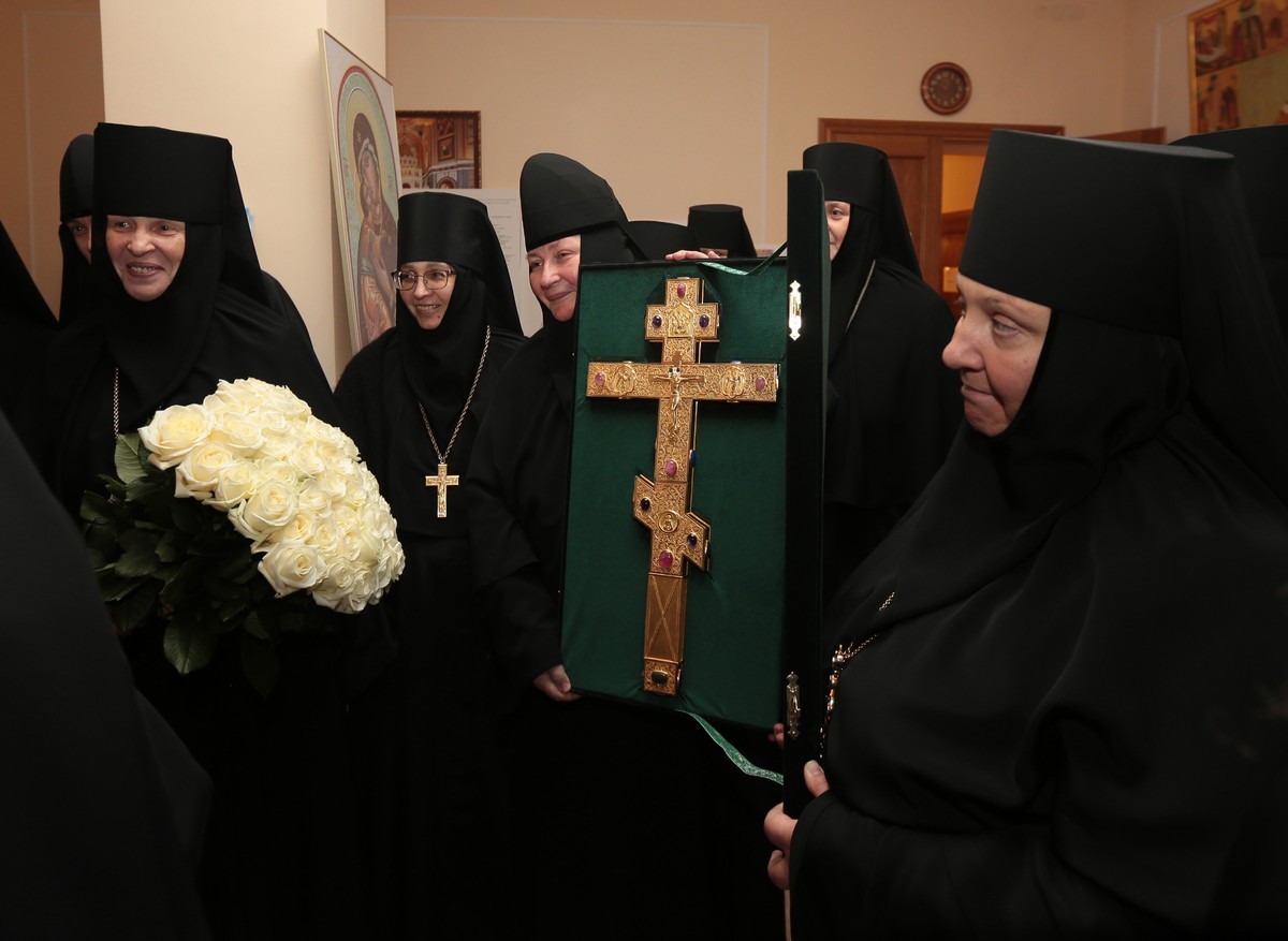 Святейший Патриарх вручил игумении Иулиании наперсный крест, изготовленный по случаю 1000-летия преставления святого равноапостольного князя Владимира.
