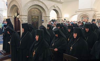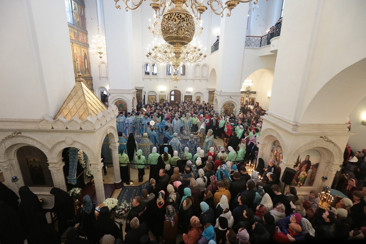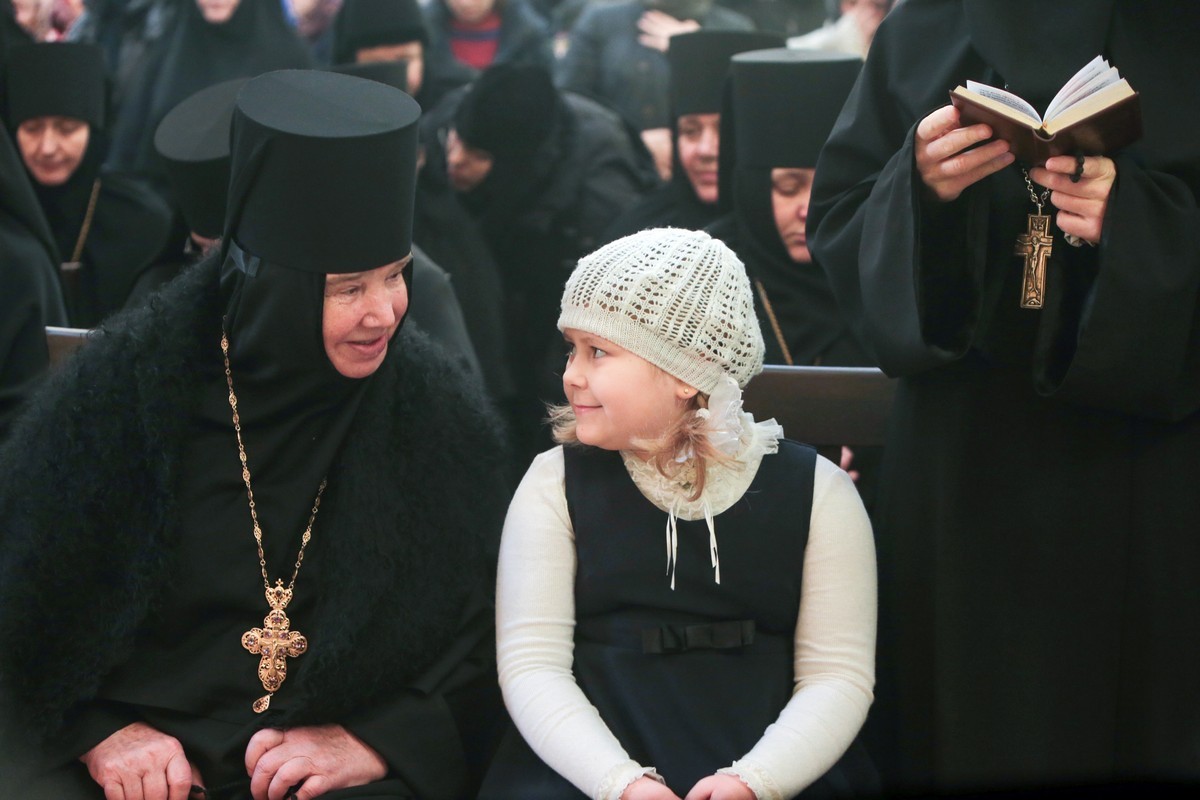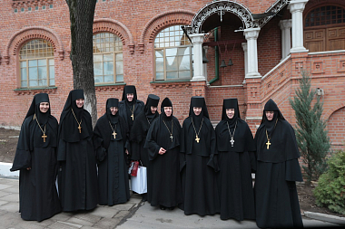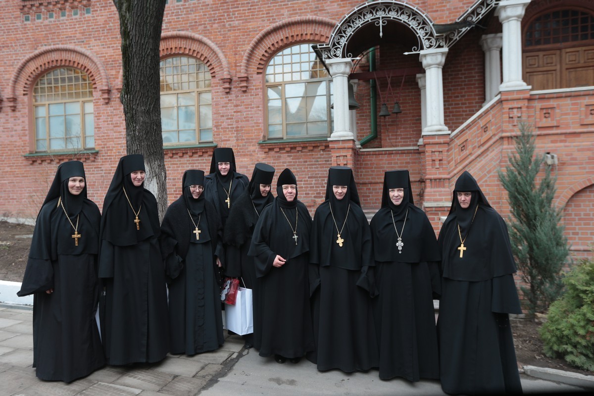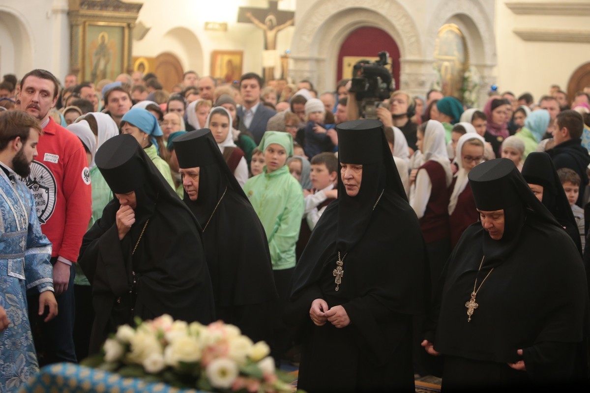 За богослужением молились: Заместитель Председателя Синодального отдела по монастырям и монашеству, настоятельница Зачатьевского ставропигиального женского монастыря игумения Иулиания (Каледа) с сестрами; настоятельница Богородице-Рождественского ставропигиального женского монастыря игумения Викторина (Перминова); руководитель Юридической службы Московской Патриархии, настоятельница Алексеевского ставропигиального женского монастыря игумения Ксения (Чернега); настоятельница Борисоглебского Аносина ставропигиального женского монастыря игумения Мария (Солодовникова); настоятельница Покровского Хотькова ставропигиального женского монастыря игумения Олимпиада (Баранова); настоятельница ставропигиального женского монастыря Марфо-Мариинская обитель милосердия игумения Елисавета (Позднякова); настоятельница Кресто-Воздвиженского Иерусалимского ставропигиального женского монастыря игумения Екатерина (Чайникова); настоятельница Троице-Одигитриевского ставропигиального женского монастыря Зосимова пустынь игумения Фаина (Кулешова); настоятельница Казанской Амвросиевской ставропигиальной женской пустыни Шамордино игумения Сергия (Щербакова); настоятельница Свято-Троицкого Александро-Невского ставропигиального женского монастыря в с. Акатове игумения Антония (Минина); настоятельница московского подворья Свято-Успенского Пюхтицкого ставропигиального женского монастыря игумения Филарета (Смирнова); настоятельница Александро-Невского Свято-Тихвинского женского монастыря г. Екатеринбурга игумения Домника (Коробейникова); настоятельница Свято-Троицкого Серафимо-Дивеевского женского монастыря игумения Сергия (Конкова); настоятельница Богородицкого Житенного женского монастыря в г. Осташкове Тверской области игумения Елисавета (Евдокимова); старшая сестра женской монашеской общины Патриаршего подворья в с. Шостье Рязанской области монахиня Неонилла (Фролова).