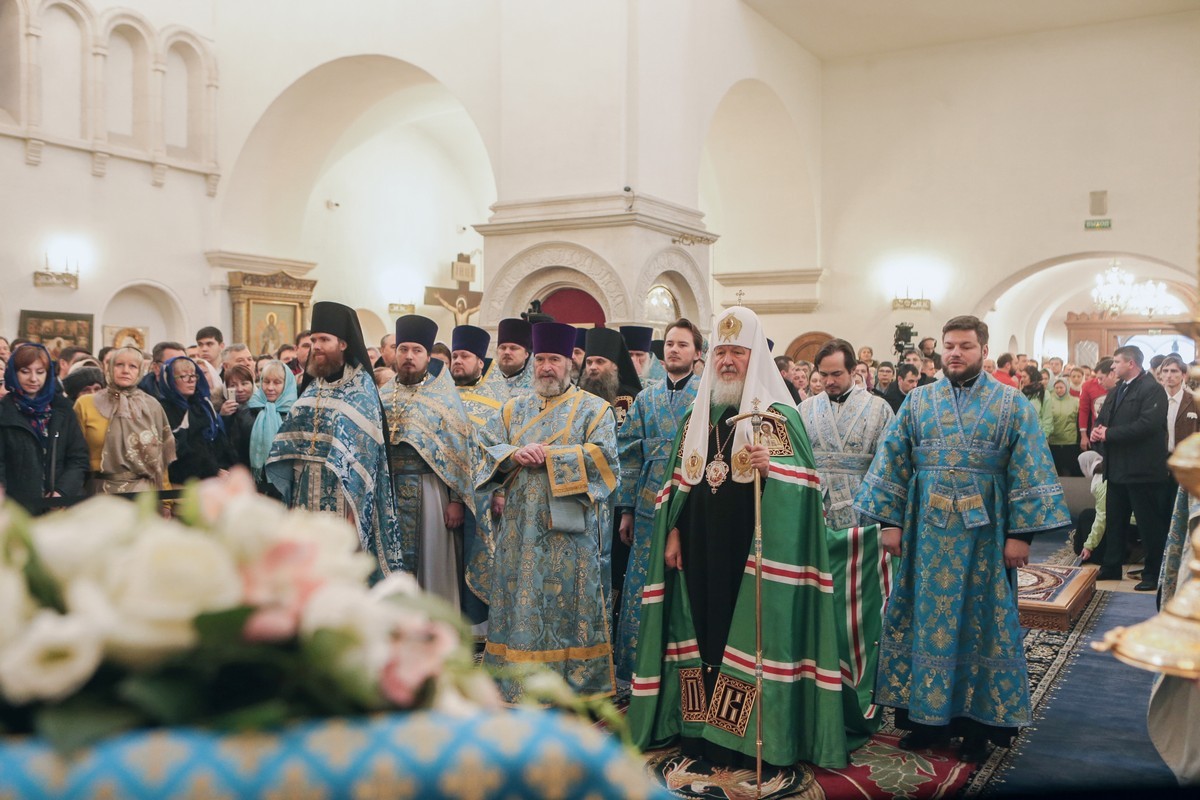 Его Святейшеству сослужили: митрополит Санкт-Петербургский и Ладожский Варсонофий, управляющий делами Московской Патриархии; митрополит Воронежский и Лискинский Сергий; митрополит Курский и Рыльский Герман; епископ Дмитровский Феофилакт, наместник Андреевского ставропигиального мужского монастыря; епископ Солнечногорский Сергий, Руководитель Административного секретариата Московской Патриархии; епископ Россошанский и Острогожский Андрей; епископ Губкинский и Грайворонский Софроний; протоиерей Владимир Диваков, секретарь Патриарха Московского и всея Руси по г. Москве; протоиерей Михаил Рязанцев, ключарь кафедрального соборного Храма Христа Спасителя г. Москвы; игумен Петр (Еремеев), наместник Высоко-Петровского ставропигиального мужского монастыря; игумен Варфоломей (Петров), наместник Николо-Угрешского ставропигиального мужского монастыря; духовенство г. Москвы.