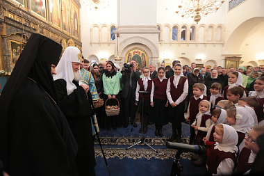 Также с праздничным днем Патриарха Кирилла поздравили воспитанники Воскресной школы при Зачатьевском монастыре.