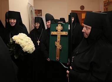 В дар обители Предстоятель Русской Церкви передал старинный серебряный напрестольный крест.