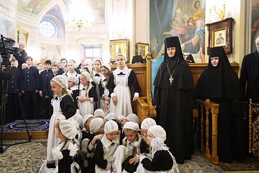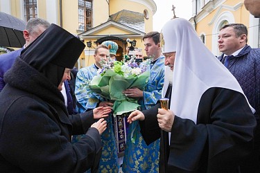 У дверей храма Предстоятеля Русской Православной Церкви встречали: настоятельница Покровского монастыря игумения Феофания (Мискина); председатель Либерально-демократической партии России, председатель Комитета по международным делам Государственной Думы Федерального Собрания Российской Федерации Л.Э. Слуцкий; секретарь Патриарха Московского и всея Руси по г. Москве протопресвитер Владимир Диваков; благочинный Покровского округа Московской (городской) епархии, настоятель храма преподобного Василия Исповедника у Рогожской Заставы г. Москвы протоиерей Олег Егоров; насельницы обители и воспитанницы монастырского приюта для девочек.