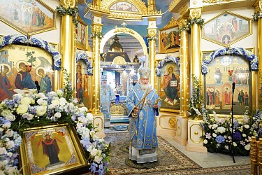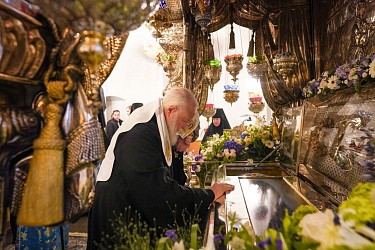 По прибытии в монастырь Святейший Патриарх Кирилл поклонился честным мощам блаженной Матроны, почивающим в нижней церкви храма Покрова Пресвятой Богородицы.
