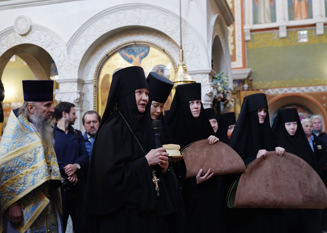 Настоятельница Зачатьевского монастыря игумения Иулиания (Каледа) приветствовала Святейшего Патриарха Кирилла и преподнесла Предстоятелю просфору с оттиском дореволюционной монастырской печати и частицей, вынутой за здравие Его Святейшества, а также комплект орлецов, созданных сестрами монастыря.