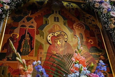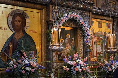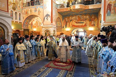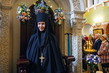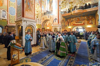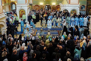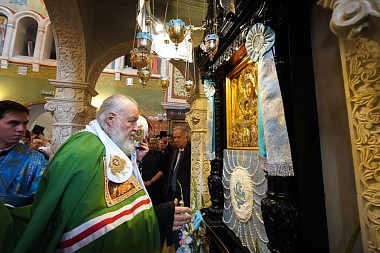 Перед началом богослужения у врат храма Предстоятеля Русской Православной Церкви встречала настоятельница обители, заместитель председателя Синодального отдела по монастырям и монашеству игумения Иулиания (Каледа). Святейший Владыка проследовал в собор Рождества Пресвятой Богородицы, где поклонился гробнице с иконными изображениями основательниц Зачатьевского монастыря игумении Иулиании и монахини Евпраксии, а также чудотворной иконе Божией Матери «Милостивая».