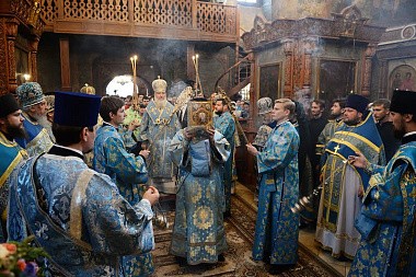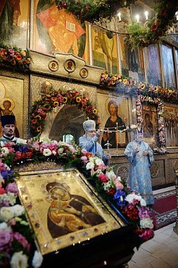 По окончании богослужения наместник обители архимандрит Тихон приветствовал Предстоятеля Русской Православной Церкви и преподнес Его Святейшеству список Владимирской иконы Божией Матери.