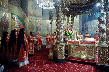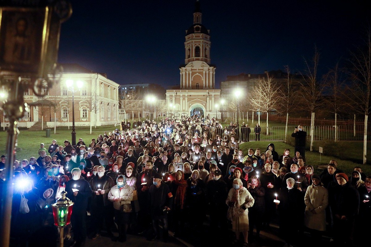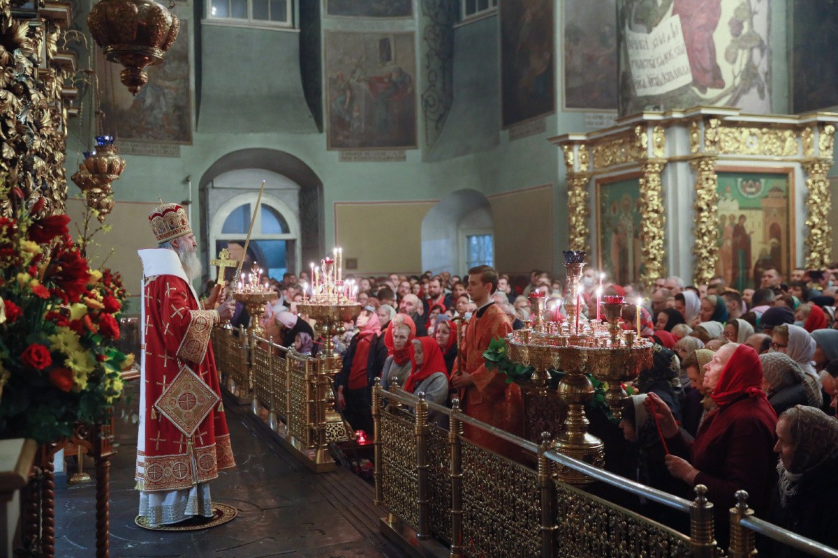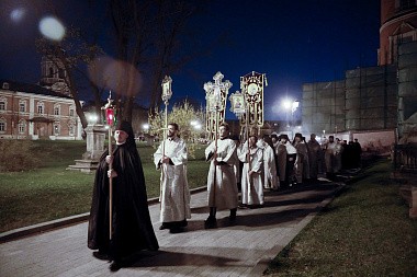 В полночь в обители был совершен пасхальный крестный ход, который символизирует шествие мироносиц ко гробу Спасителя. Затем началась праздничная утреня, во время которой исполнялся пасхальный канон, прославляющий победу Спасителя.