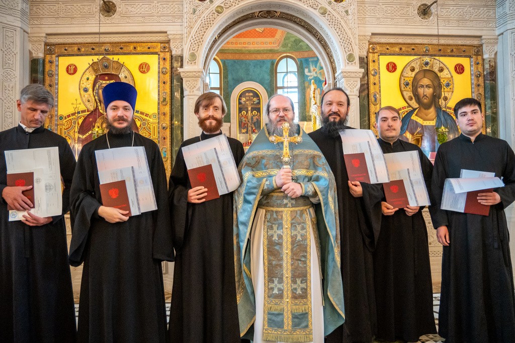 После отпуста Литургии выпускникам вручили свидетельства об окончании обучения. Игумен Иоанн обратился к ним со словами: «Дорогие братья и сестры! Сегодня, в праздник Владимирской иконы Божией Матери, у нас в Сретенской духовной академии, которой в этом году исполняется 25 лет со дня начала ее существования, происходит еще одно событие. Три года назад в Сретенской духовной академии была открыта аспирантура. За эти три года студенты нашей духовной академии провели свои исследования. Сегодня они получают свидетельства об окончании аспирантуры. Они подготовили свои диссертации, но это еще только часть работы. Впереди им предстоит представить эти исследования в диссертационные советы и защитить их».