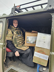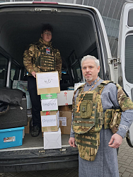 Казначей монастыря монахиня Ювеналия (Королева) вместе с протоиереем Константином (Королевым), послушницей Серафимой и волонтером Алексеем Даниловым доставили груз в Кураховку.