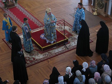 По окончании литургии Его Преосвященство поздравил настоятельницу монастыря игумению Сергию, всех сестер и паломников с праздником Владимирской иконы Пресвятой Богородицы. В своем слове владыка напомнил, что 6 июля – сугубый праздник Калужской земли. В этот день в 1480 году хан Золотой Орды Ахмат с громадными полчищами подошел уже к реке Угре, которую называют «поясом Богоматери», охраняющим московские владения. Целый день войска хана и Московского князя стояли друг против друга, не приступая к решительным действиям. Вся Москва молилась своей Заступнице Пресвятой Богородице о спасении православной столицы, и по Ее молитвам враги бежали, гонимые страхом. Матерь Божия – Царица Небесная и земная – неутомимо молится за всех нас, а мы будем непрестанно просить Ее о помощи и заступлении.