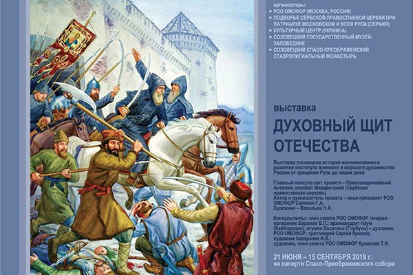На паперти Спасо-Преображенского собора Соловецкого ставропигиального мужского монастыря работала передвижная художественная выставка «Духовный щит Отечества».