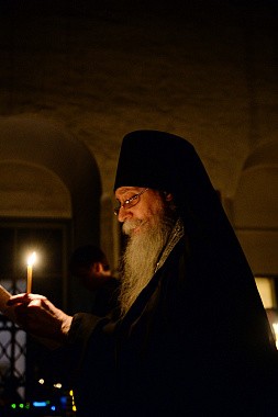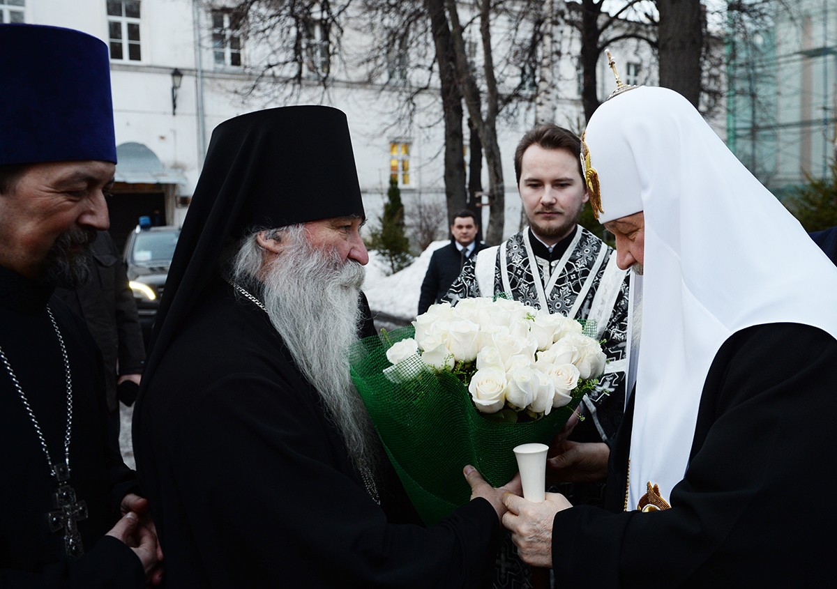 По окончании великого повечерия епископ Феофилакт приветствовал Святейшего Владыку и преподнес Его Святейшеству репринтное издание Требника свт. Петра (Могилы) и украшенную росписью шкатулку.