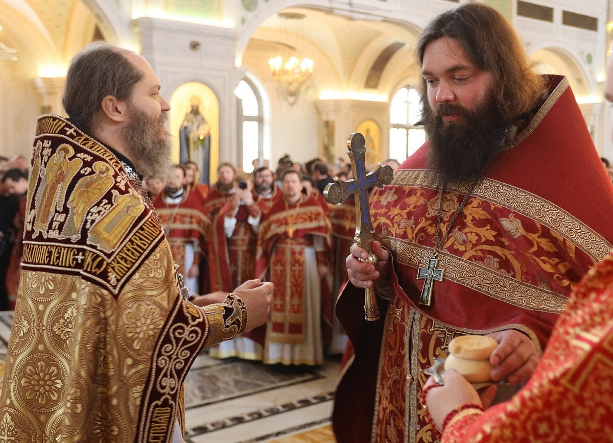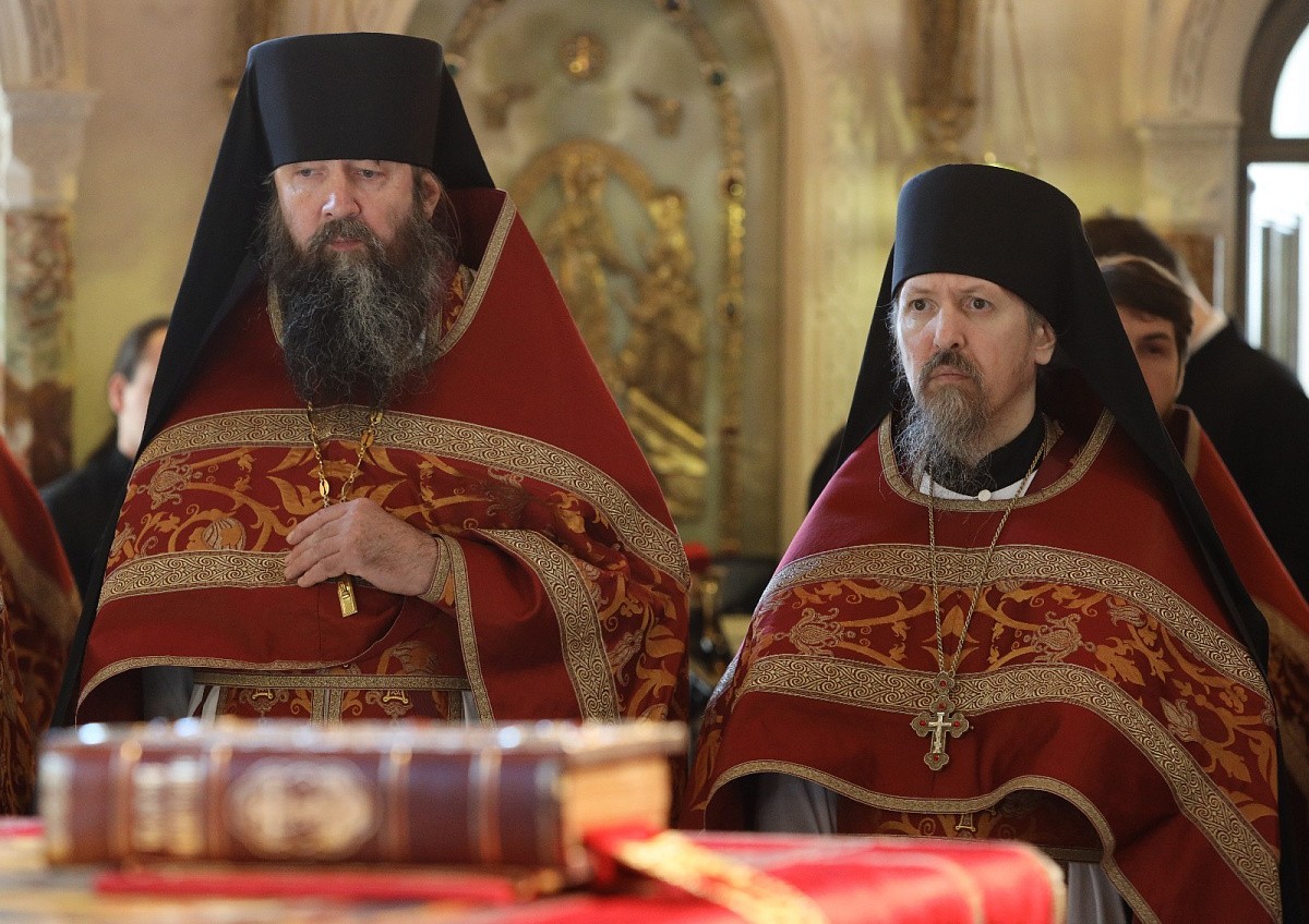 За Литургией в храме Воскресения Христова и Новомучеников и исповедников Церкви Русской наместнику Сретенского монастыря сослужили наместник Псково-Печерского монастыря иеромонах Иларион (Карандеев),гости и выпускники обители, братия в священном сане