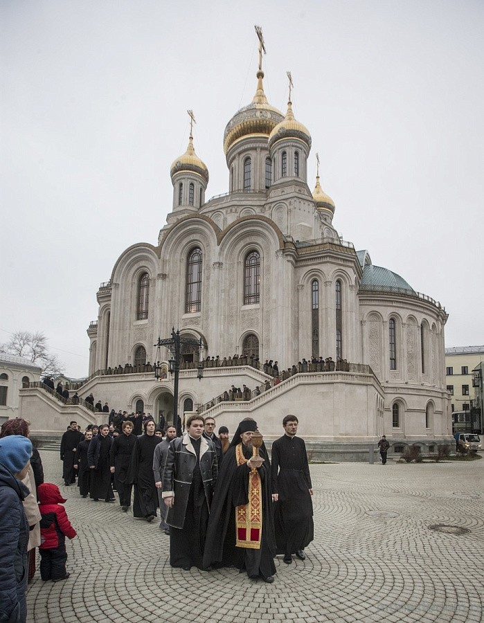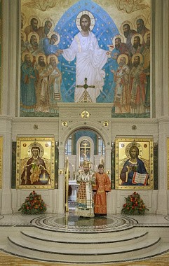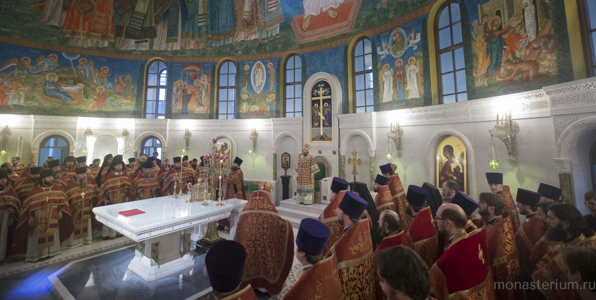 Позднюю Божественную литургию в храме Воскресения Христова и Новомучеников и исповедников Церкви Русской отслужил наместник Сретенского ставропигиального монастыря, председатель Патриаршего совета по культуре епископ Егорьевский Тихон в сослужении священноиноков обители, многочисленного клира г. Москвы и выпускников Сретенской духовной семинарии в священном сане.