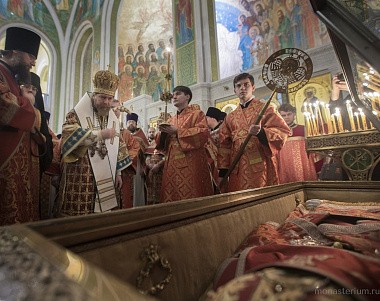 В завершение богослужения Его Преосвященство вместе со всеми собравшимися в храме совершил славление священномученику Илариону, архиепископу Верейскому, святые мощи которого пребывают в монастырском храме Воскресения Христова и Новомучеников и исповедников Церкви Русской.