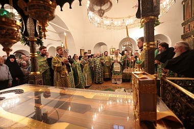 Всенощное бдение было отслужено в храме преподобного Стефана, где под спудом почивают его святые мощи. На великой вечерне лития совершалась на улице.