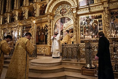 Накануне наместник лавры епископ Сергиево-Посадский Парамон совершил всенощное бдение в Успенском соборе обители.