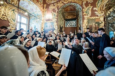Церковные песнопения исполнил смешанный хор Троице-Сергиевой лавры под управлением архимандрита Глеба (Кожевникова).