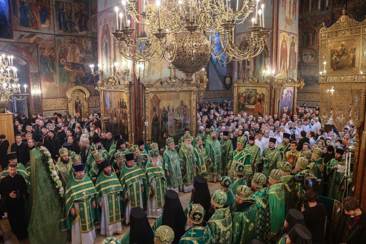 За Божественной литургией в Успенском соборе песнопения исполнили: справа – мужской хор под управлением иеромонаха Нестора (Волкова), слева – мужской хор под управлением чтеца Владислава Пилюгина.