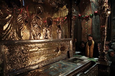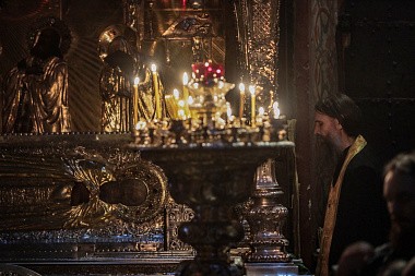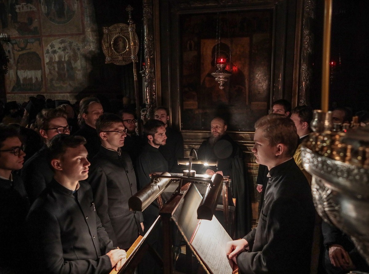 Церковные песнопения исполнил знаменный хор Лавры под управлением иеромонаха Зиновия (Бубякина).