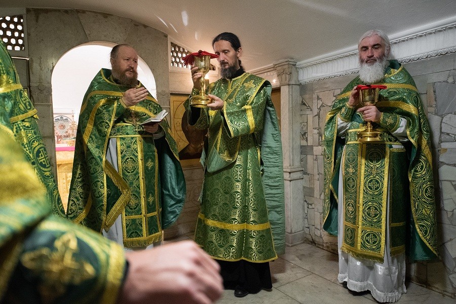 Литургию в приделе святых Радонежской земли в крипте Успенского собора возглавил благочинный Лавры архимандрит Павел (Кривоногов).