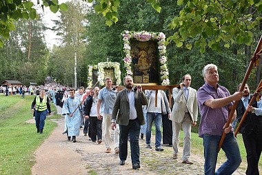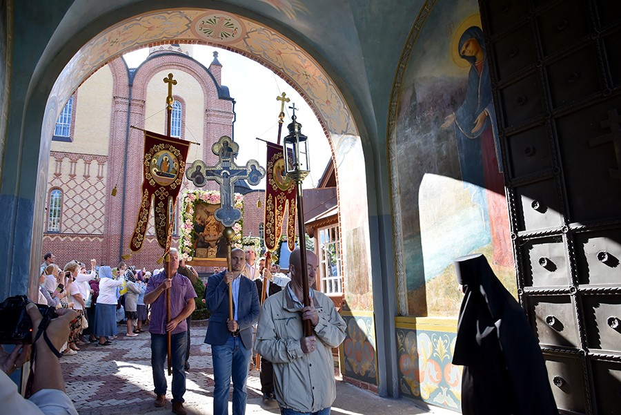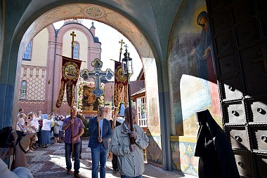 Затем состоялся традиционный крестный ход с чудотворным образом Успения Пресвятой Богородицы на Святой источник. По возращении с крестного хода паломникам в монастыре была предложена праздничная трапеза.