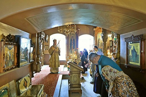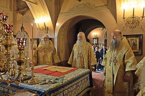 Его Высокопреосвященству сослужили наместник Высоцкого монастыря епископ Серпуховской Роман, наместник Николо-Угрешского ставропигиального монастыря епископ Егорьевский Мефодий, наместник Николо-Пешношского монастыря игумен Алексий (Горлычев), братия обители в священном сане.