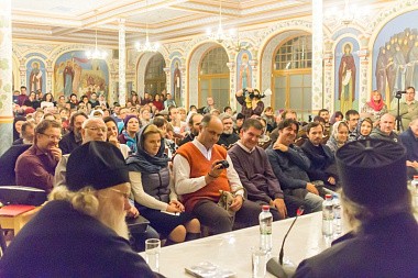 Многочисленную аудиторию встречи составили слушатели Высших богословских курсов, участники и зрители программ «Лучезарного Ангела», православная молодежь, прихожане Зачатьевской обители.